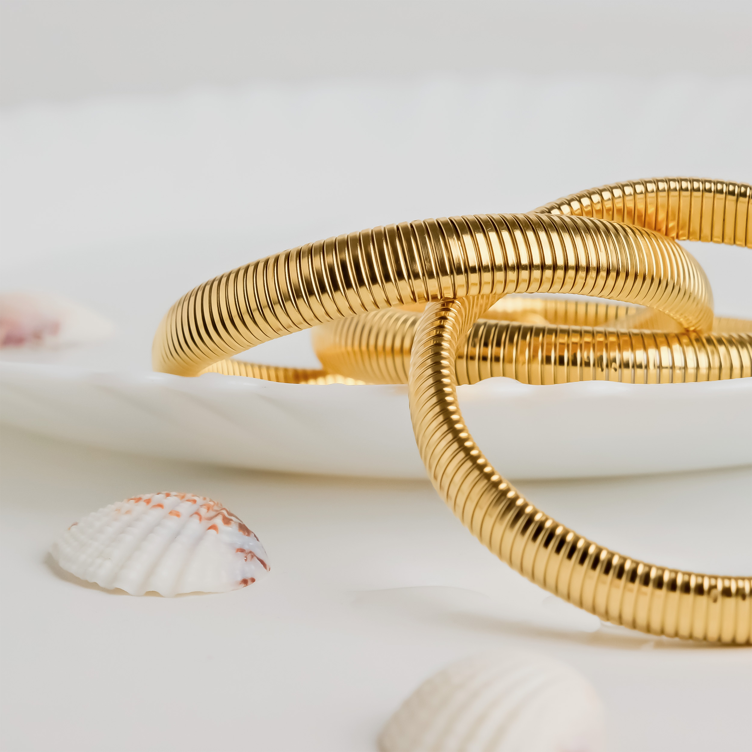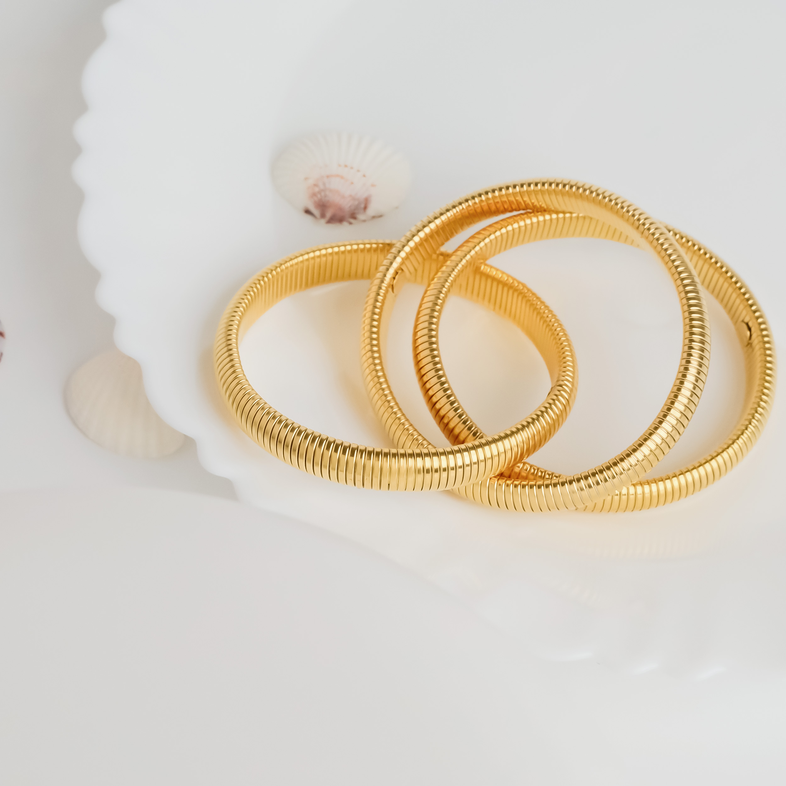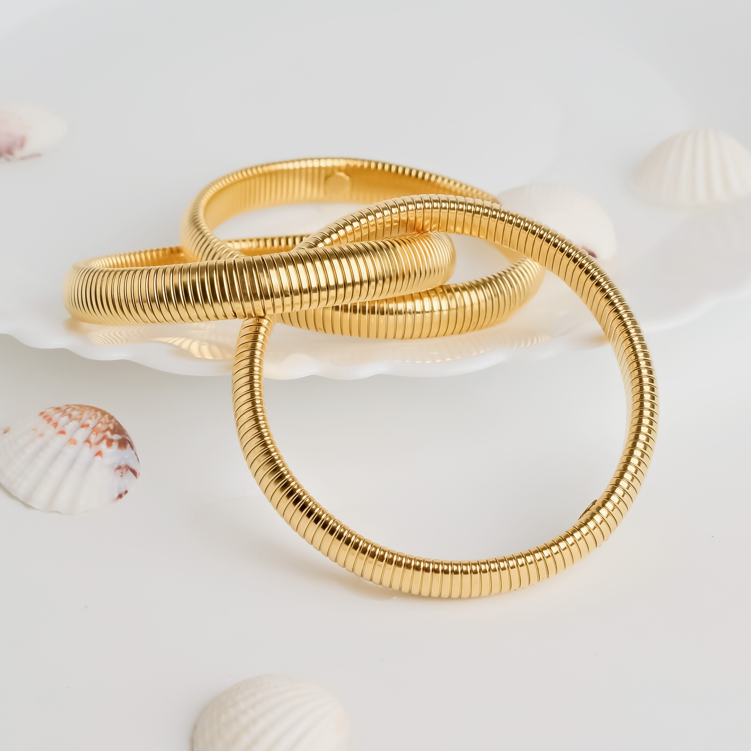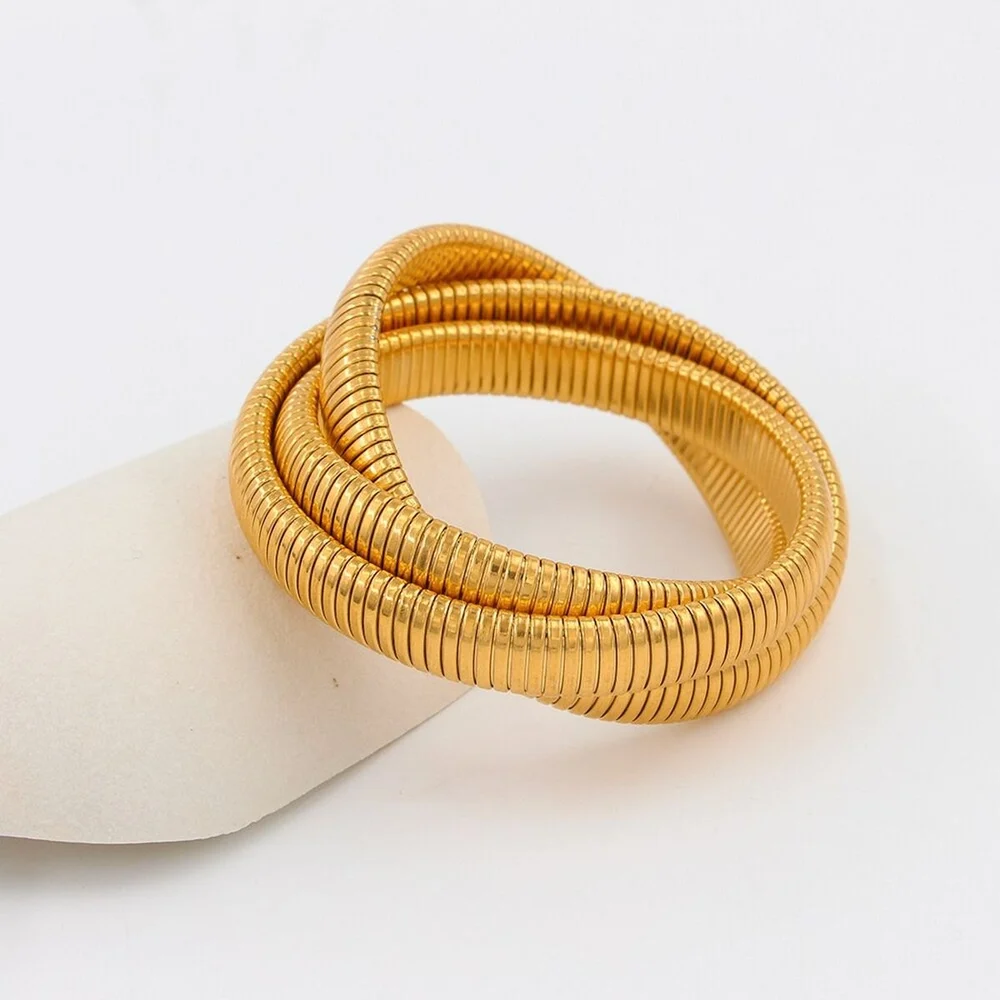 Inspired by Bhumi Pednekar, This stunning bracelet boasts a three-layered serpentine pattern. This sleek bracelet will enhance your elegance. The stunning piece, crafted from high-quality stainless steel, has a sleek, coiled design that wraps perfectly around your wrist. Its beautiful gold finish is tarnish-resistant and waterproof, ensuring long-term beauty and durability. The Golden Serpent Bracelet is suitable for every event, bringing a touch of elegance and modern flair to your jewellery collection. Embrace timeless style with this eye-catching and versatile accessory.