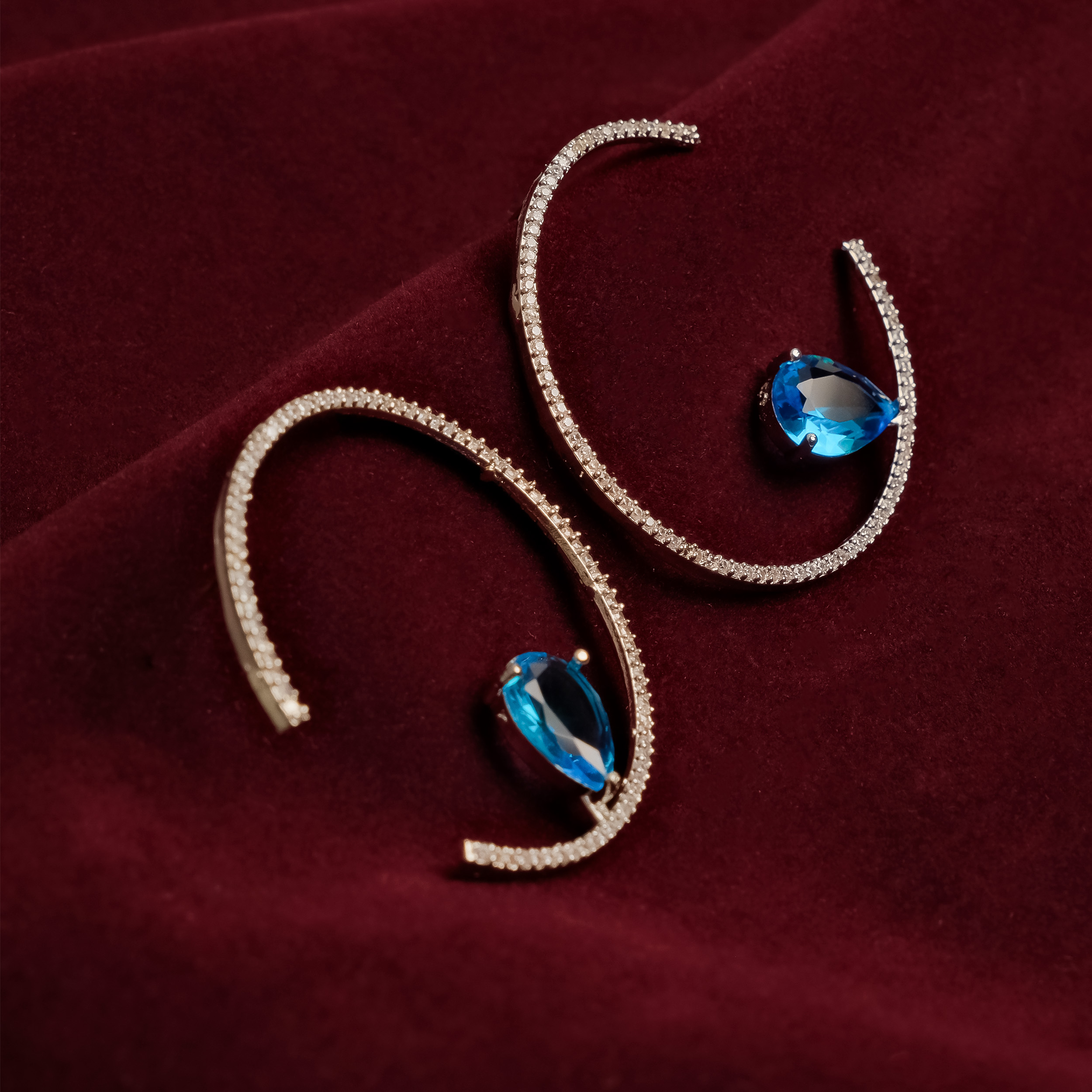 Experience the allure of midnight with Fayah’s Midnight Blue Sapphire Hoops. These captivating earrings feature a unique, open-circle design, where a delicate sapphire stone, reminiscent of a twilight sky, is suspended within a halo of sparkling American Diamonds. The minimalist design, with its clean lines and subtle asymmetry, creates a modern and sophisticated look. These earrings are a statement piece that will add a touch of understated elegance and a hint of mystery to any ensemble.
